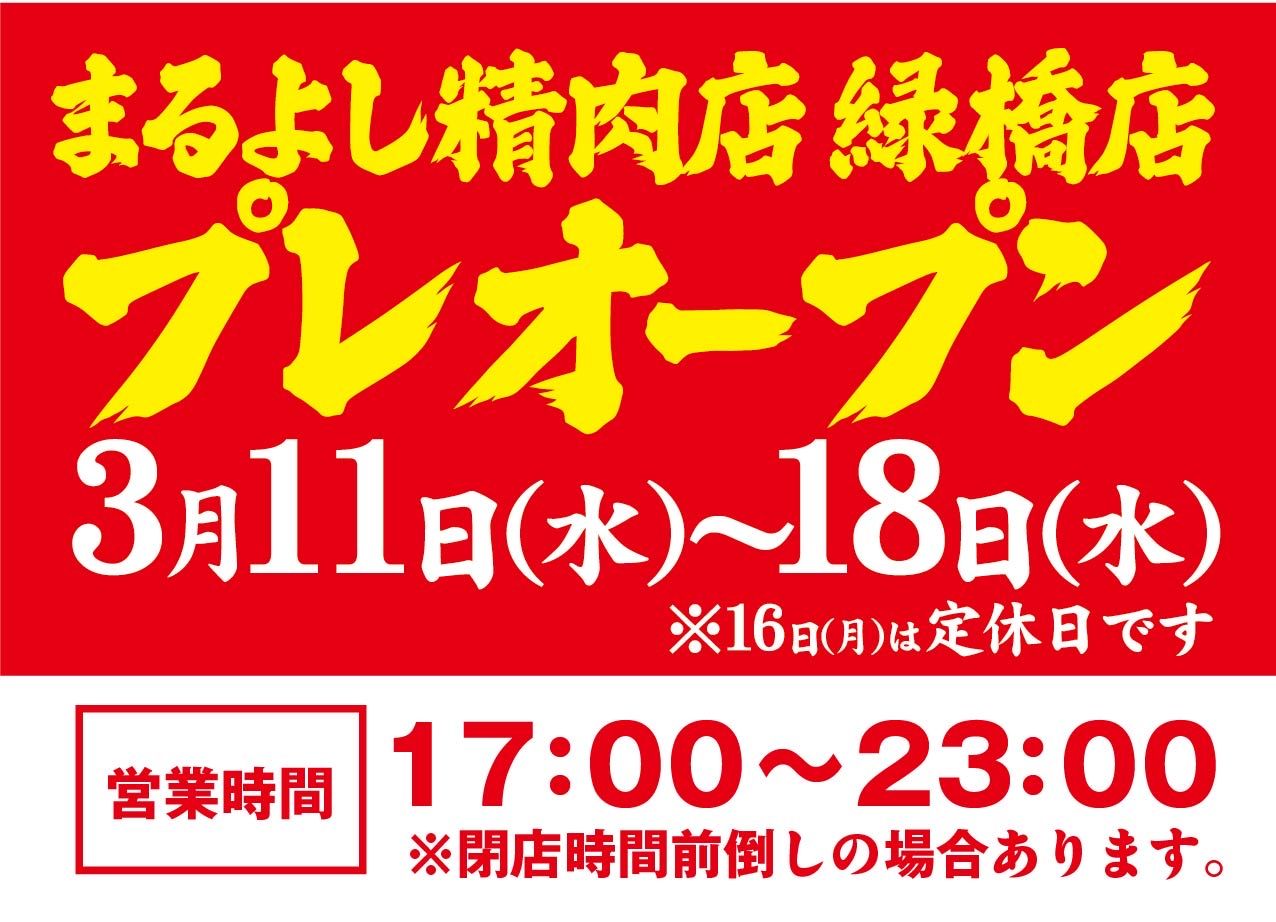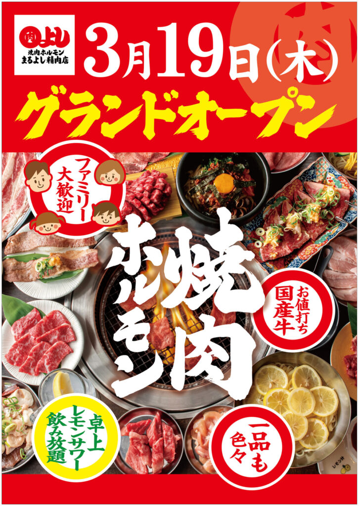 焼肉ホルモンまるよし精肉店 緑橋店OPENします。 2026-03-03 2026年3月19日(木) 焼肉ホルモンまるよし精肉店 緑橋をOPENします。 前へ お知らせ一覧 最新のお知らせ 焼肉ホルモンまるよし精肉店 緑橋店OPENします。 2026-03-03 和牛のまるよし 谷四店OPENします。 2025-08-12 大衆酒場まるよし あべちか店OPENします。 2025-08-12 大衆酒場まるよし 京橋コムズ店OPENしました。 2025-03-27 大衆酒場まるよし天満橋店OPENしました。 2024-12-27